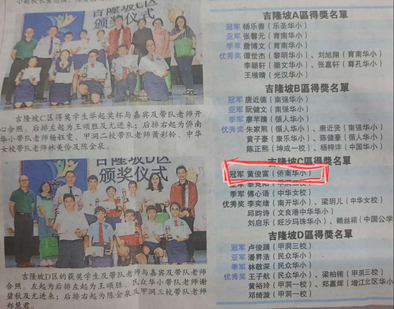 恭喜6M班的黄俊富同学荣获吉隆坡C区冠军🏆