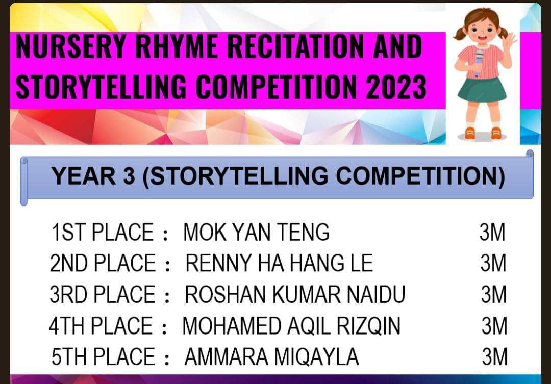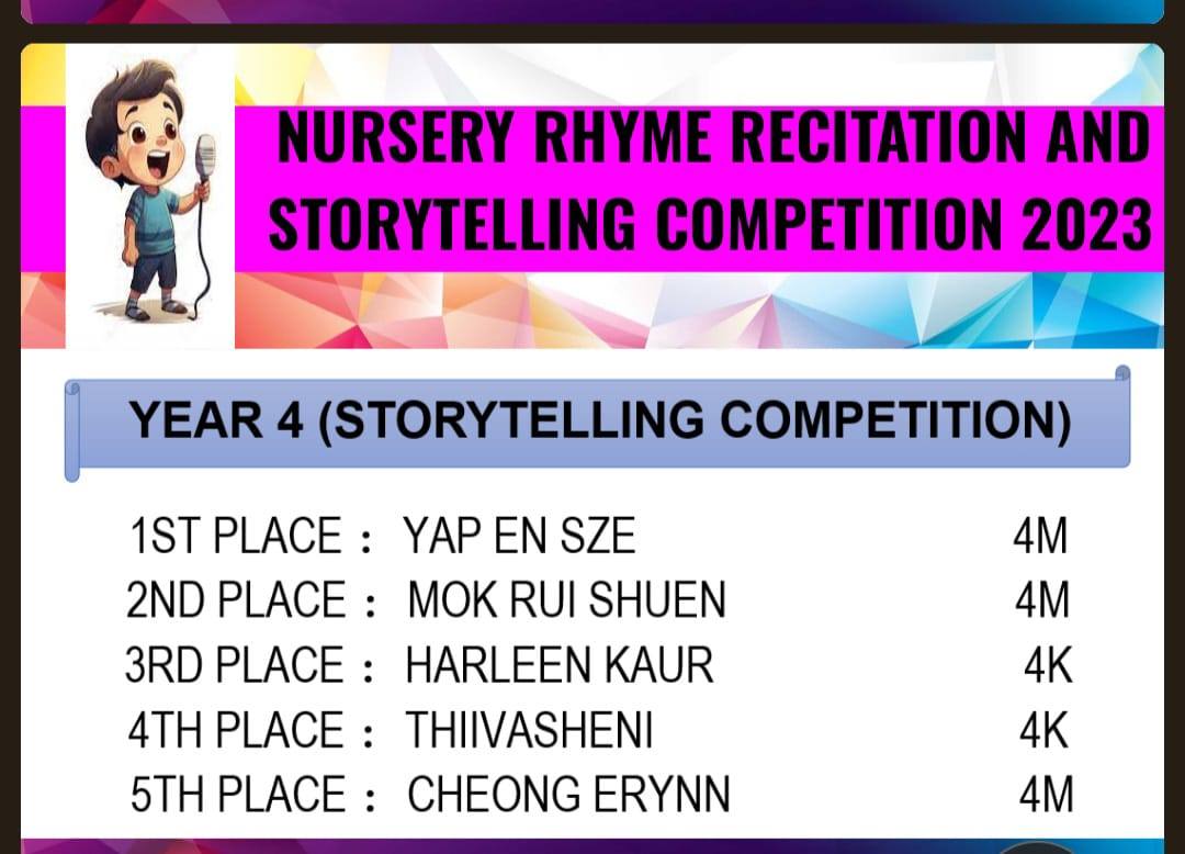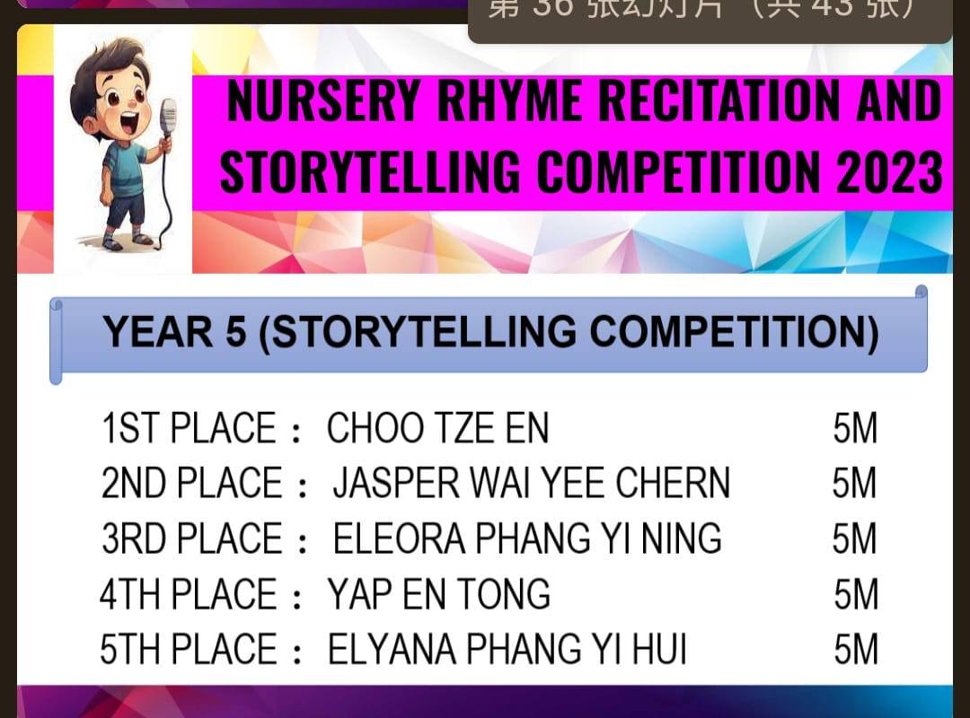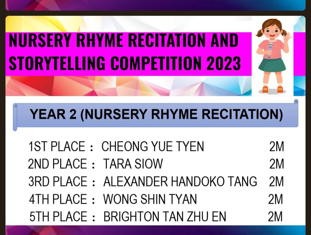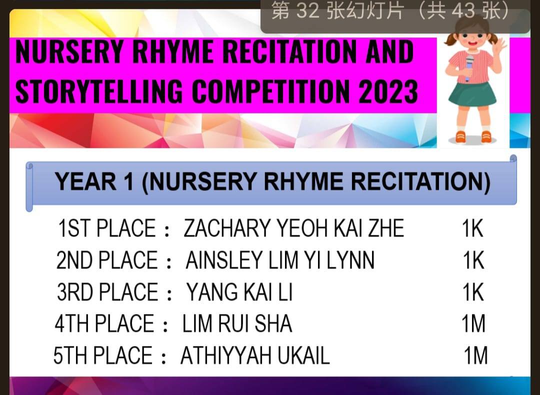 Nursery Rhyme Recitation and Storytelling Competiton 2023 Post published:November 28, 2023 Post category:Event / News / Notice Congratulations to all ━Winners of Nursery Rhyme Recitation and Storytelling━ Competiton 2023 Read more articles Previous Post2023年校内绘画及填色比赛Next Post2023年现场诗歌创作比赛