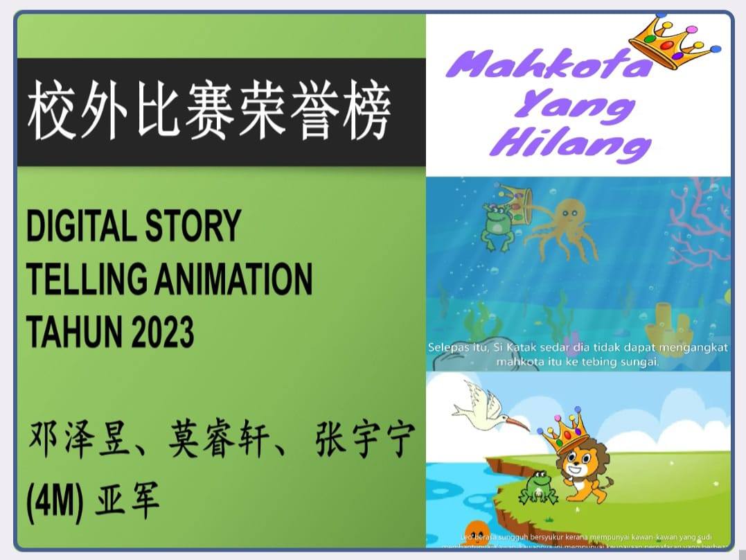 DIGITAL STORY TELLING ANIMATION 2023 Post published:January 14, 2024 Post category:Event / News / Notice ✯ 2023年侨南华小 ✯ * ✯ DIGITAL STORY TELLING ANIMATION 2023 ★ ★ °· ✯ °★。 ▁▂▃▄▅▆▇▇▆▅▄▃▁▂▃. 恭喜4M班的邓泽昱,莫睿轩,张宇宁同学在Digital Story Telling Animation 比赛中,获得亚军。为校增光,可喜可贺。 要想成功,先得拉风。 要想拉风,先得练功。 感恩李副校长、同学们及家长的付出和努力 Read more articles Previous Post新食堂 · 新气象Next PostMajlis Perpisahan Cikgu Azani