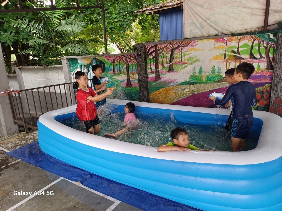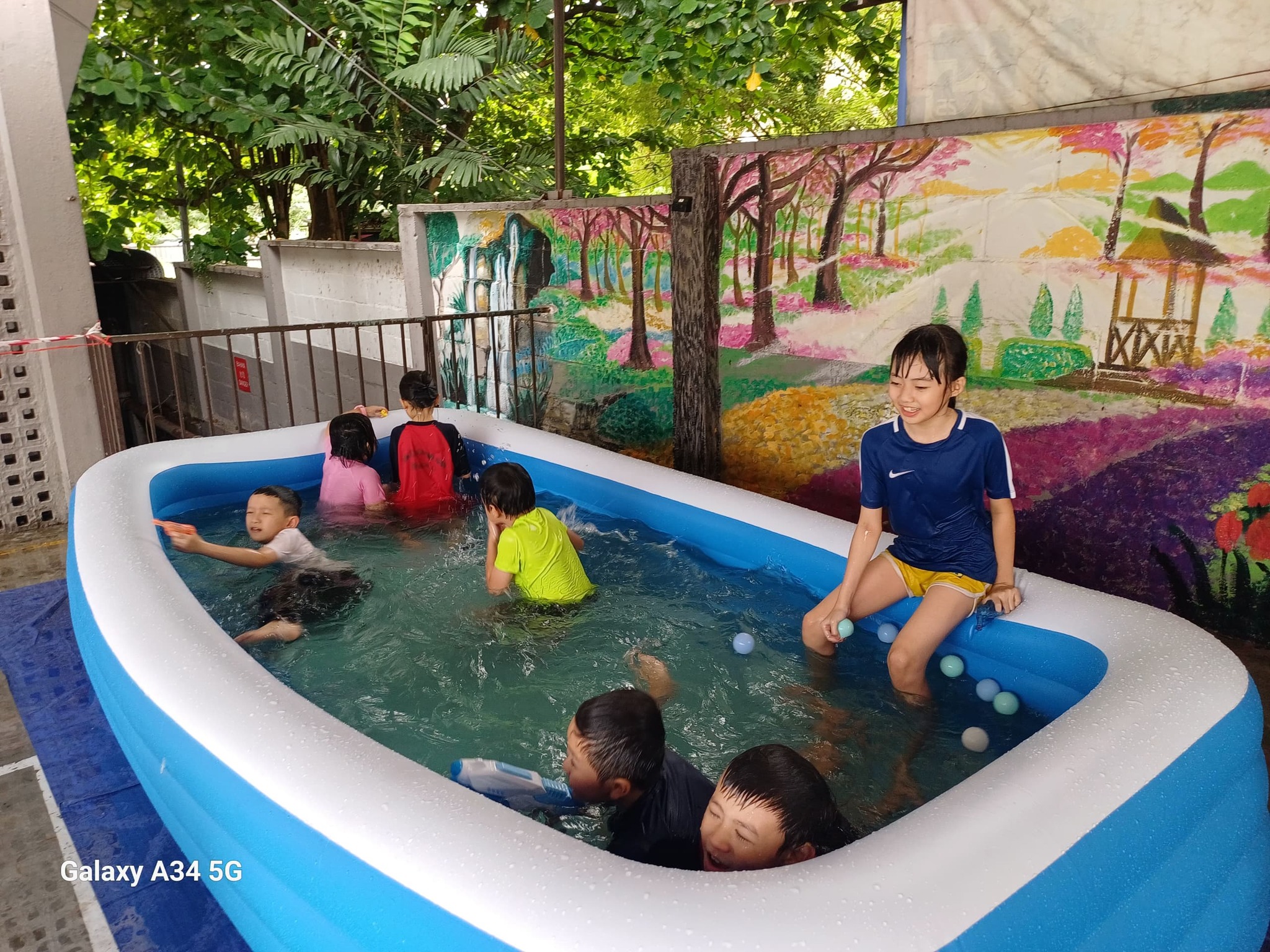 今天让幼苗督导班(安亲班)的孩子们在儿童游泳池里享受着戏水乐趣!他们笑容灿烂,快乐无比,充满了童真的幸福感。