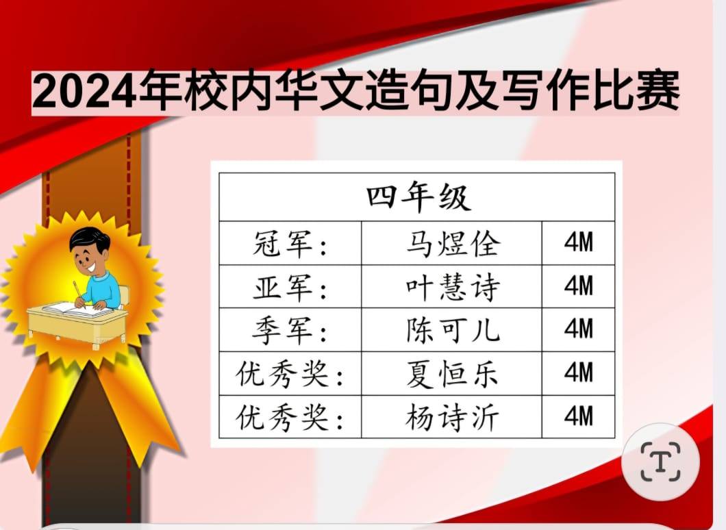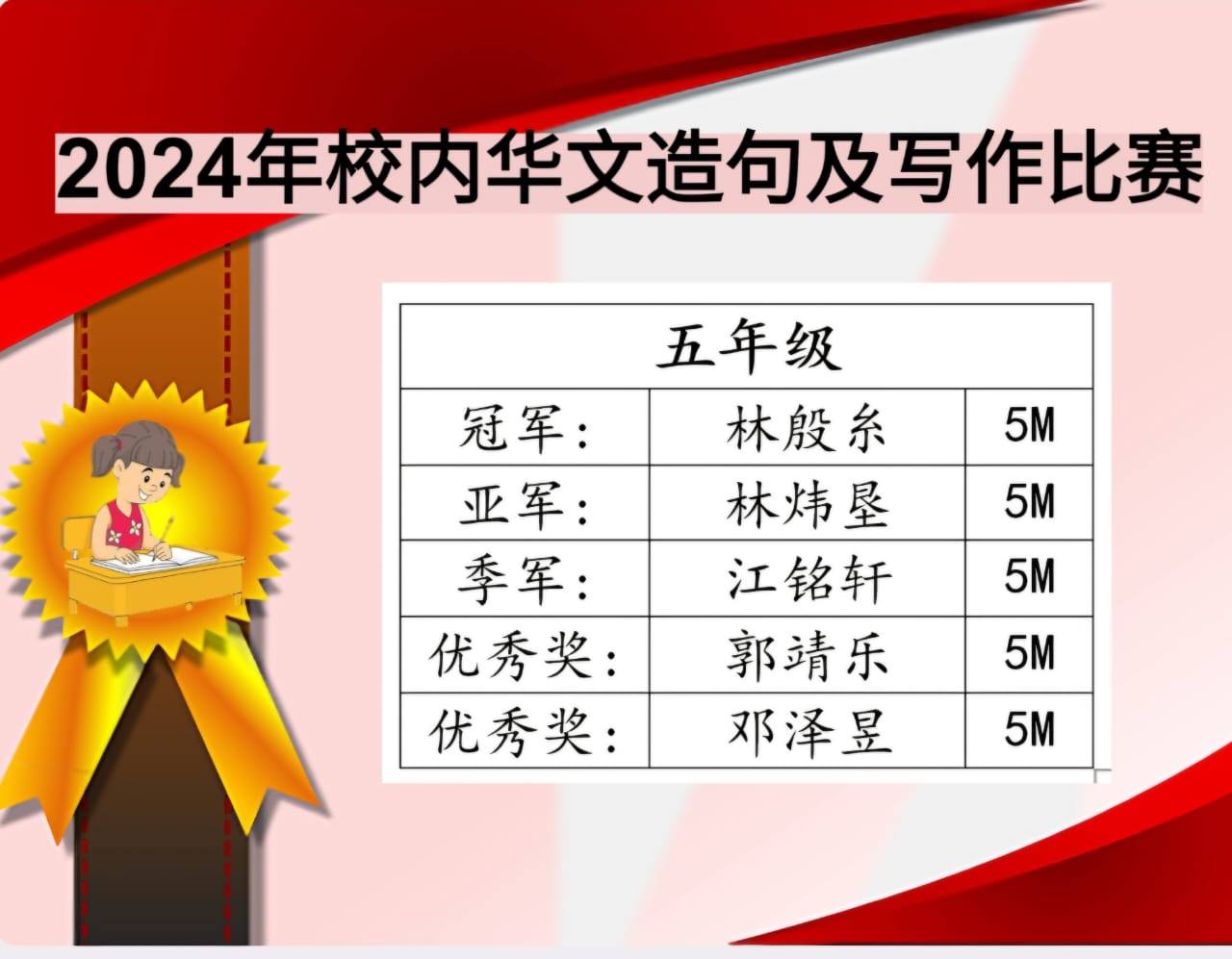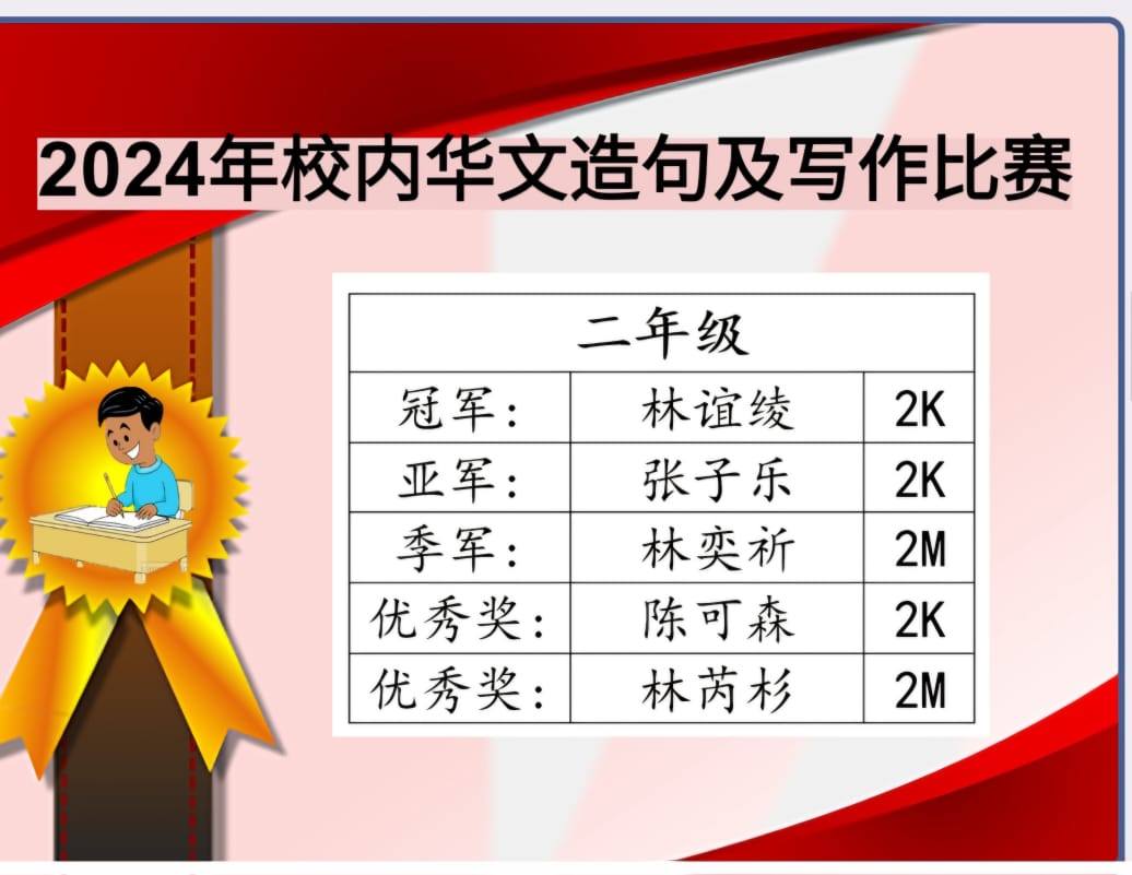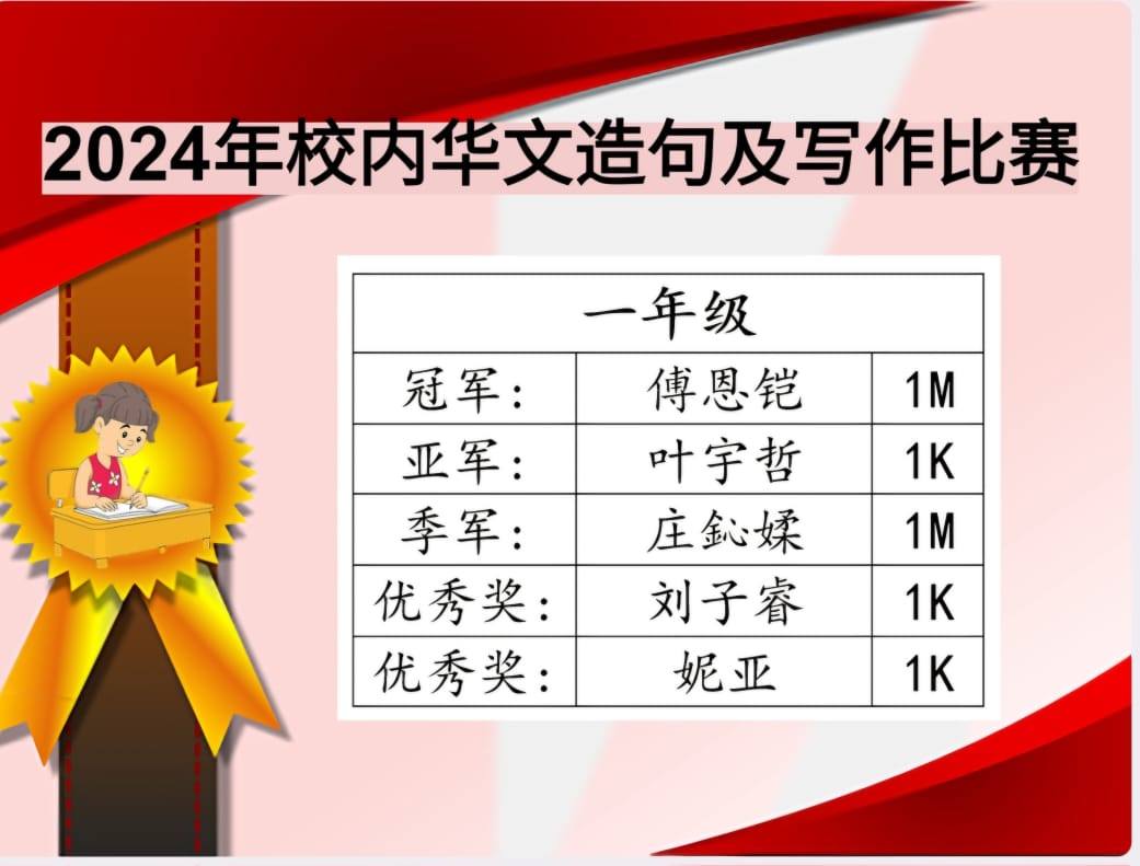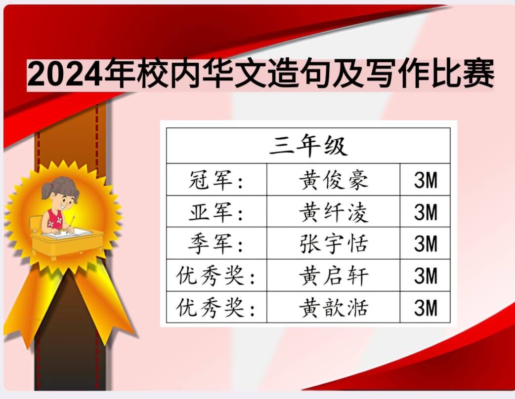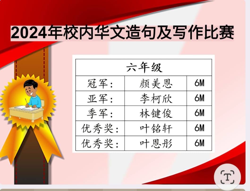 2024年校内华语造句及写作比赛 Post published:November 17, 2024 Post category:Event / News / Notice 2024年校内华语造句及写作比赛 恭喜得奖的同学 坚持不懈,总会迎来成功的曙光! 继续保持这份热情和毅力,你们一定能在学习和生活中取得更多的成就! #侨南华小百花齐放 #学校可以不一样教育可以更精彩 Read more articles Previous Post2024年10月份班级出席率奖及班级守时出席奖Next Post2024/2025第一场校园绘本导读延伸活动