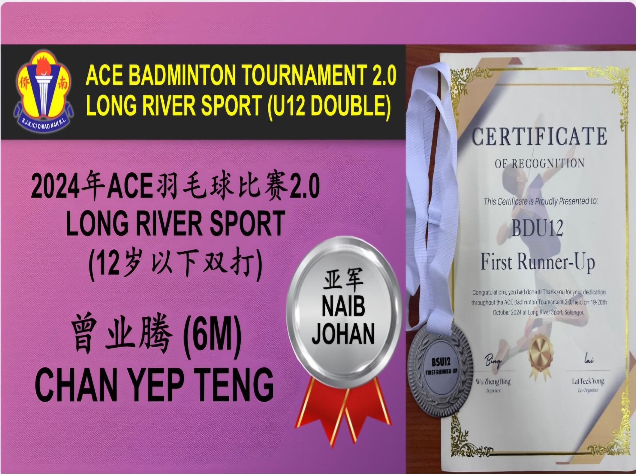 2024 年吉ACE羽毛球比赛2.0 LONG RIVER SPORT Post published:November 24, 2024 Post category:Event / News / Notice 2024 年吉ACE羽毛球比赛2.0 LONG RIVER SPORT ═━✦✦✦✭━━═━━═━━✦✦✦✭━═ 恭喜6M班的曾业腾同学在以上比赛的(12岁以下男子双打中荣获亚军。为校增光,可喜可贺。 Read more articles Previous Post侨南华小小小企业家义卖会 【新闻报导】Next PostEnglish Story Telling & Public Speaking Competition