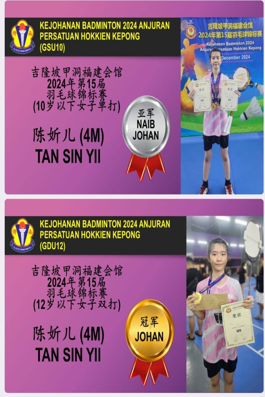 吉隆坡甲洞福建会馆2024年第15届羽毛球锦标赛 Post published:December 16, 2024 Post category:Event / News / Notice 吉隆坡甲洞福建会馆2024年第15届羽毛球锦标赛 “Kejohanan Badminton 2024 Anjuran Persatuan Hokkien Kepong “ 恭喜我校[4M班陈妡儿同学]参加了女子 ,10岁以下单打,荣获[亚军]及12岁以下女子双打【冠军】。 陈同学是我校的未来之星,凭着自己的坚持,越战越勇,很棒 感谢林美铧老师悉心训练,辛苦了 Read more articles Previous Post第17届华小童诗创作比赛Next Post2024年每月班级出席率奖及班级守时出席奖