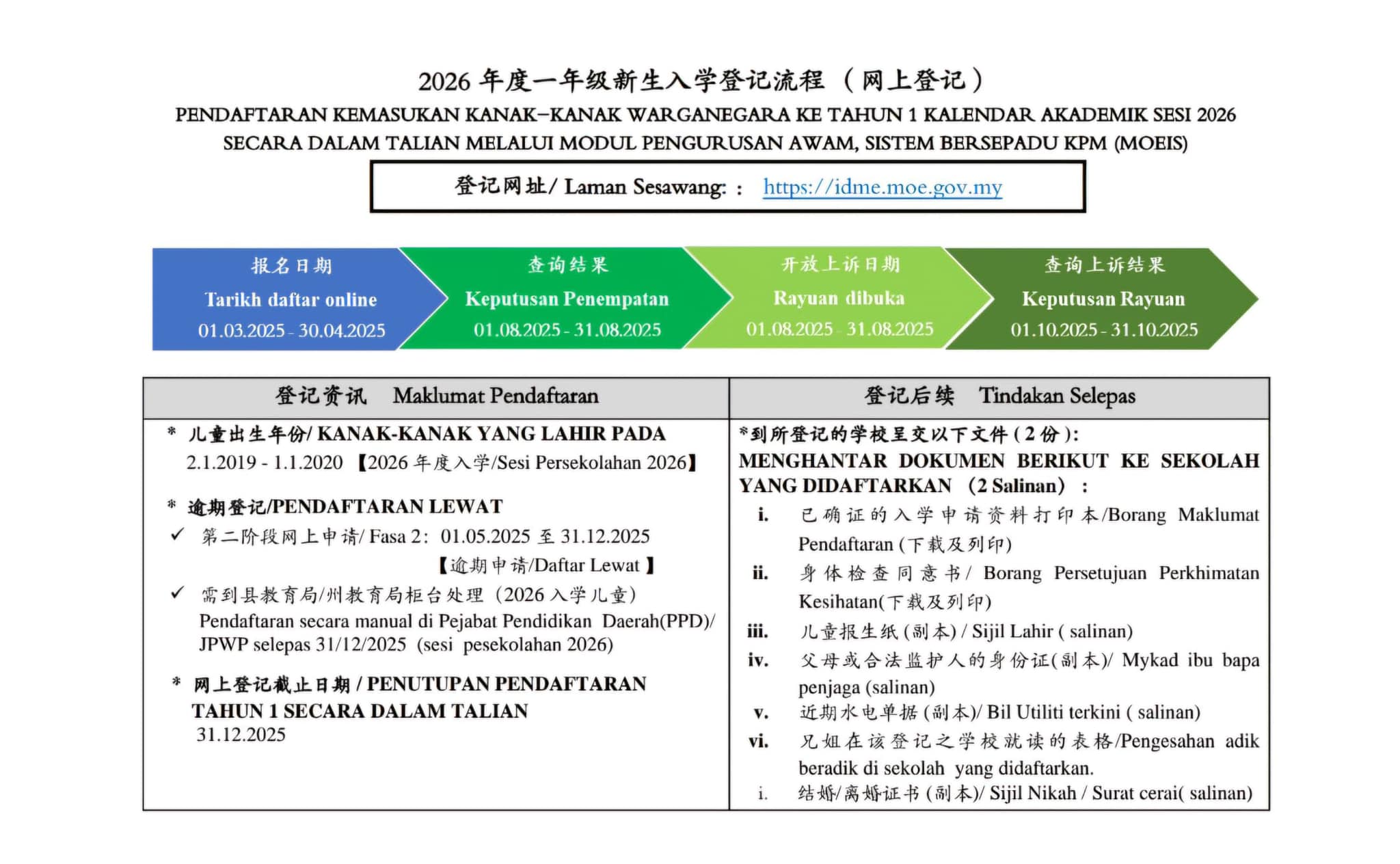 新生入学登记 Pendaftaran Secara Online bagi Murid Baharu: